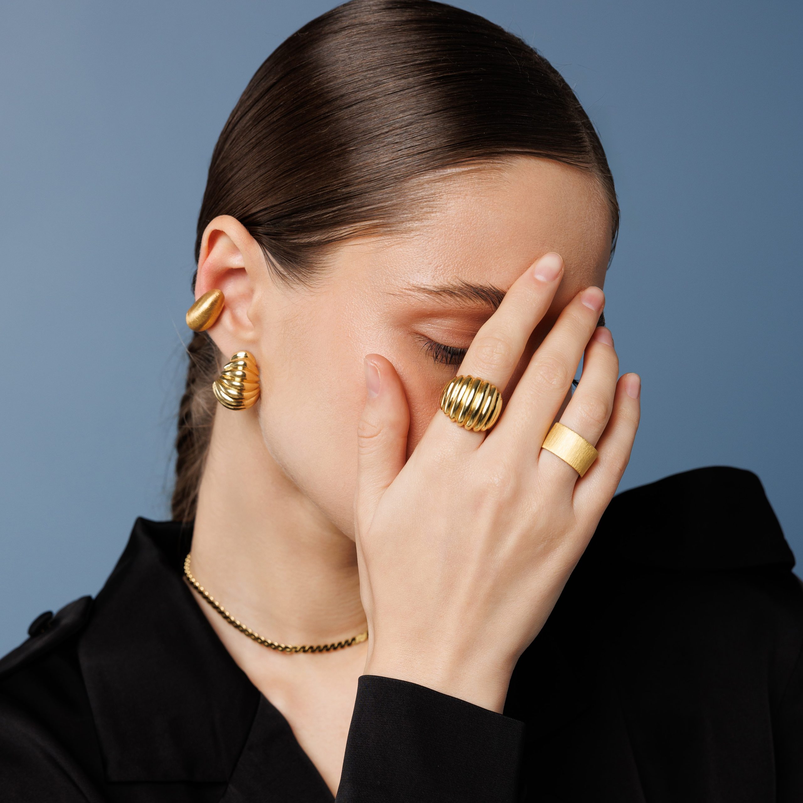 Kolczyki na sztyfcie wykonane ze srebra próby 925, pozłoconego 2 mikronami 24K złota. Wysokość kolczyków to ok 30 mm. Cena dotycy wykonania jednej pary kolczyków.
